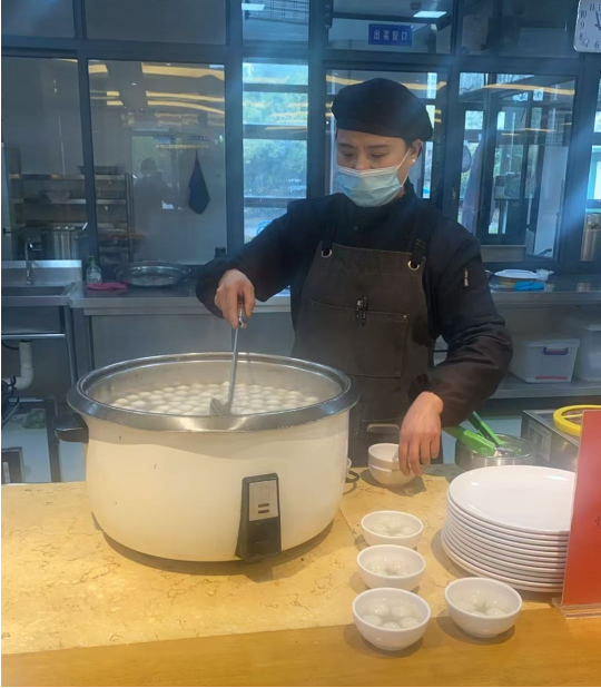 汤圆每碗盛有五颗,寓意“五福临门”,寄托着对全体教职工新一年工作顺利、身体安康的美好祝愿。午餐时分,一碗碗圆润饱满的汤圆热气氤氲,甜香四溢,窗口前欢声笑语不断,浓浓的节日氛围在餐厅内流淌。